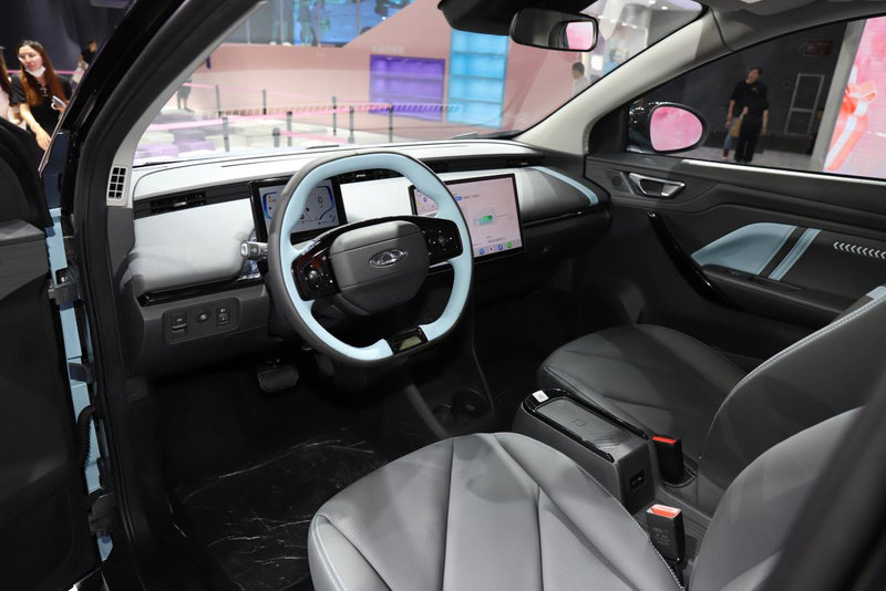 两门四座的设计,侧面比小蚂蚁要更舒展,同时还配有车顶行李架,车门把手采用的隐藏式,一块大尺寸的悬浮式中控屏位于中间,方向盘前方也是一个悬浮式的仪表盘,这些设计也算是跟上时代潮流了。