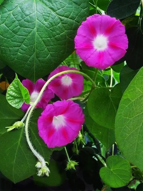 牵牛花的颜色有蓝、绯红、桃红、紫等,亦有混色的,花瓣边缘的变化较多,是常见的观赏植物。并不是什么名贵的品种,但是对乡亲而言,它却很是赏心悦目而瘦弱.记得少年时,我和小伙伴打完猪草后,看见一丛丛的颜色各异的牵牛花,很是喜爱,忍不住摘下几朵来.可不过一会儿,就见枯萎了,心里深感内疚。