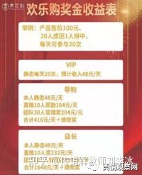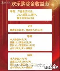 米兰街欢乐购:产品售价50元,20人成团1人拼中,每天可参与20次。VIP:静态每天20次,预计收入24元一天;导购:本人静态24元一天,直推10人奖励82元一天,团队30人管理奖102元一天,合计208元一天+绩效奖;店长:本人静态24元一天,直推10人奖励116元一天,团队200人管理奖680元一天,合计820元一天+绩效奖;
