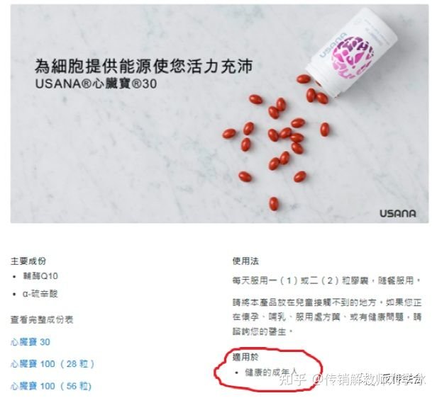 根据USANA网站上的产品介绍,这两款心脏宝虽然号称能够提供充分支持心血管健康、健全肌肉功能和健康神经功能之下不可或缺的成分,富含强效抗氧化配方,能够协助细胞制造“强大的细胞能量”,却依然和“癌症”、“转移”没有半毛钱关系。最重要的一点是,在USANA的网站上明明白白地写着,这两款心脏宝均适用于“健康”的成年人。