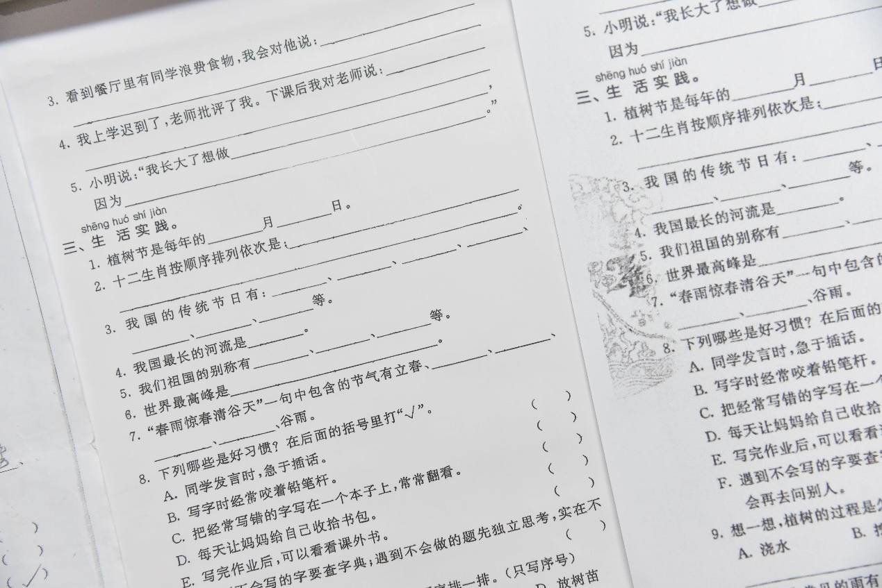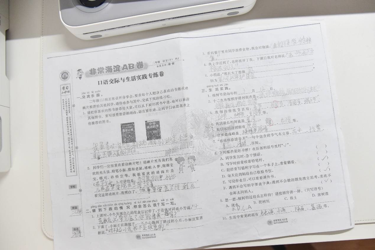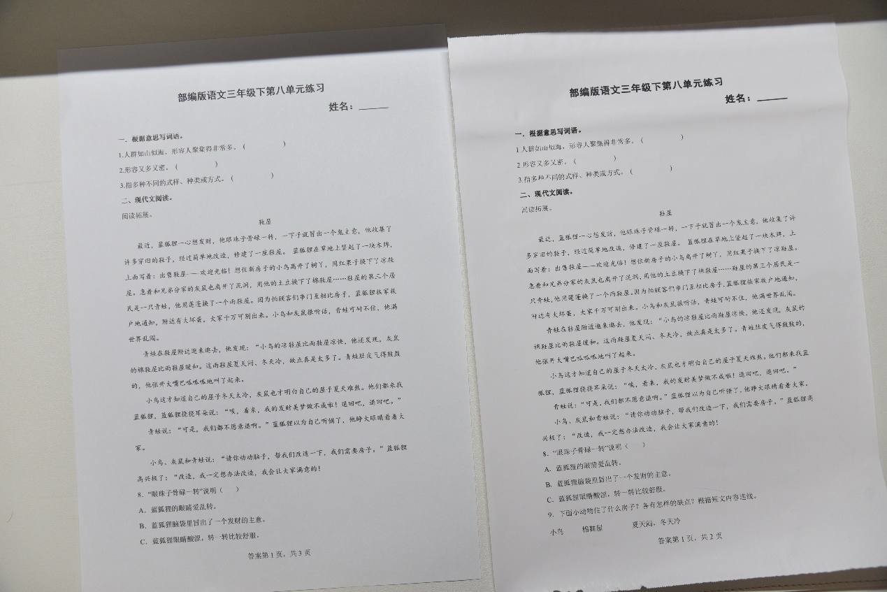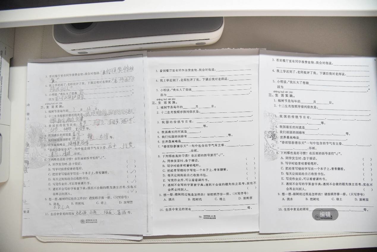 打印出来后,我们可以看下效果,左边是原来的试卷,中间为喵喵机F2S识别翻新的试卷,右边为Epson L3151翻新的内容,很可惜Epson L3151的试卷翻新功能也仅仅针对会员开放,而F2S的这个功能是免费的。从两张翻新的试卷来看,喵喵机F2S与Epson L3151都能非常干净利落地将书写字迹去除,不过喵喵机F2S还能够识别试卷中的背景图案,将背景内容一并去除,而Epson L3151则还是会保留这部分内容。