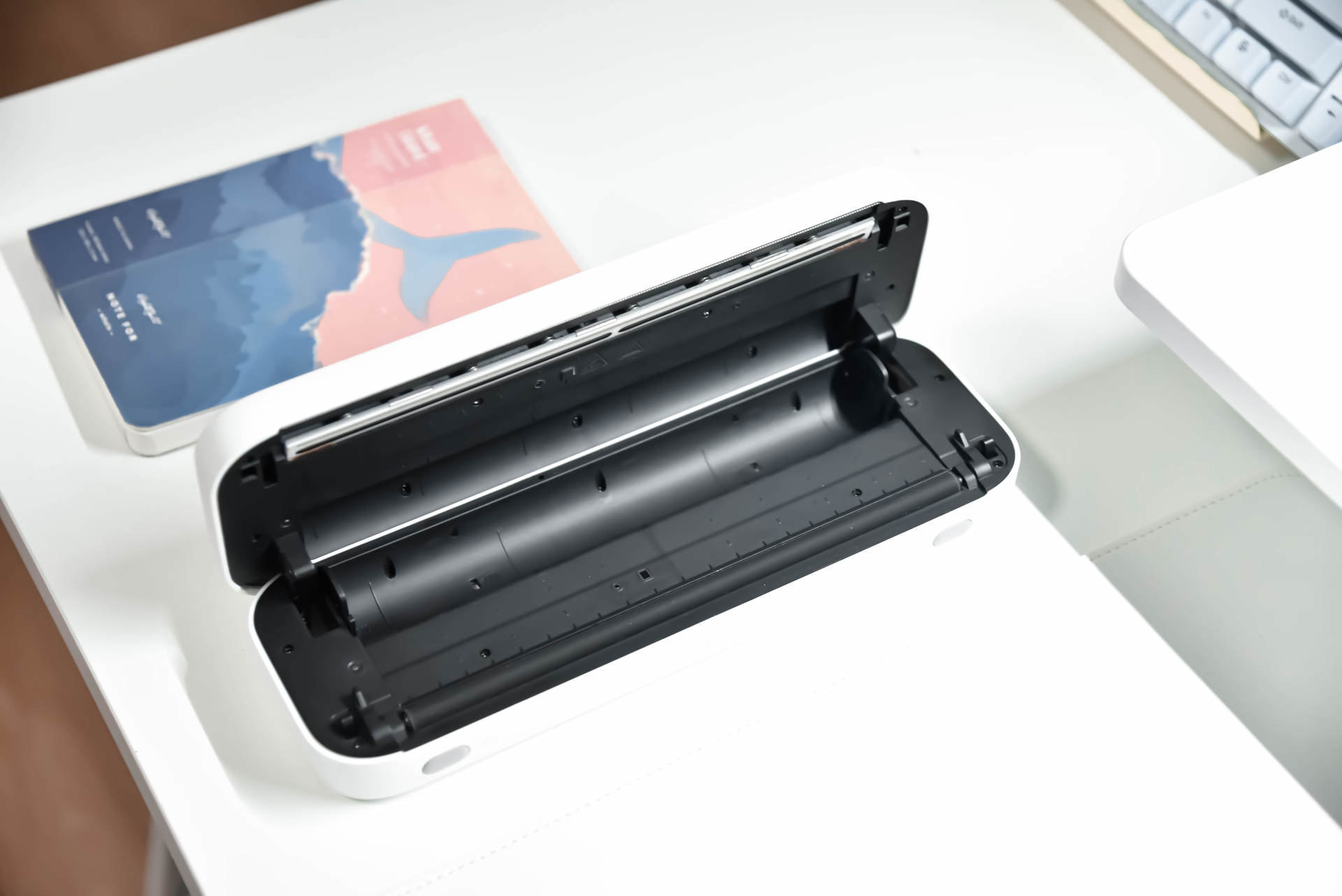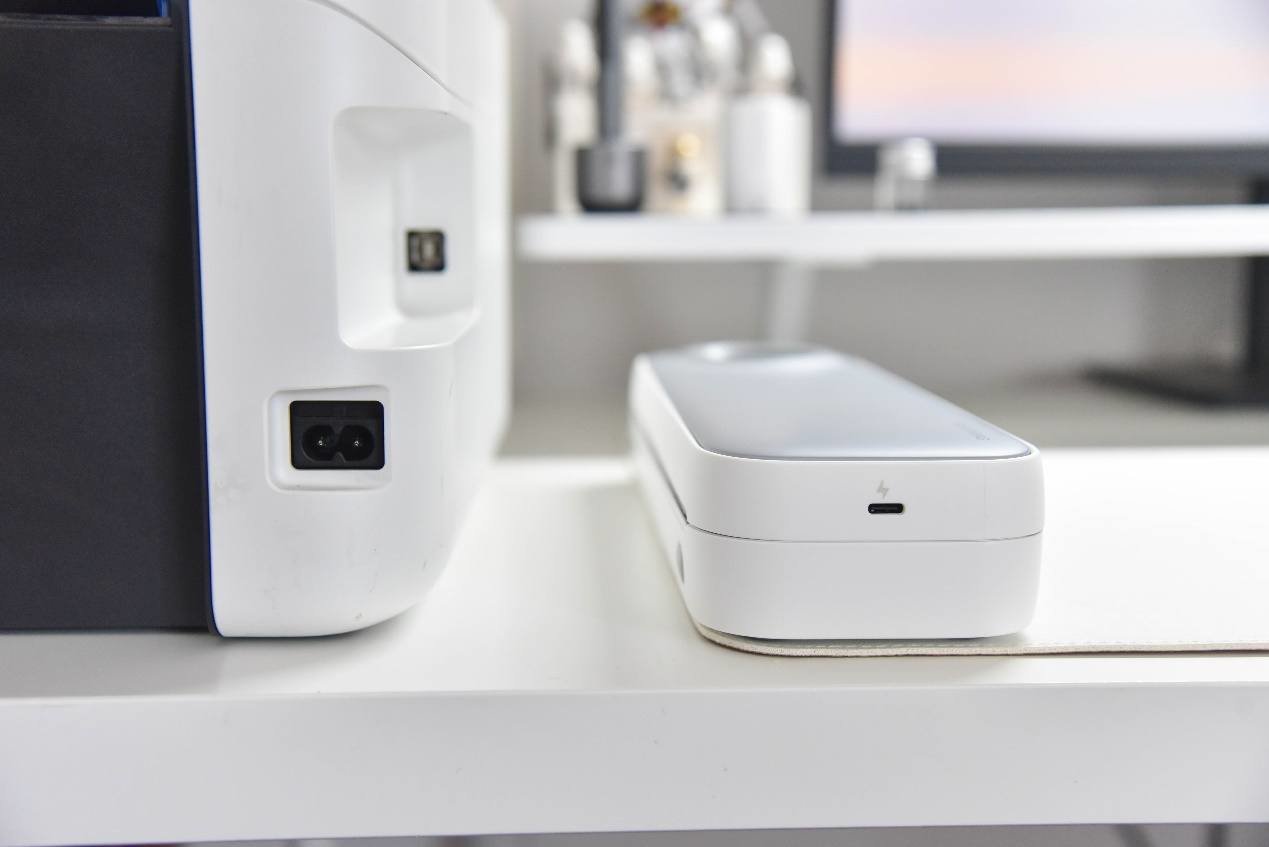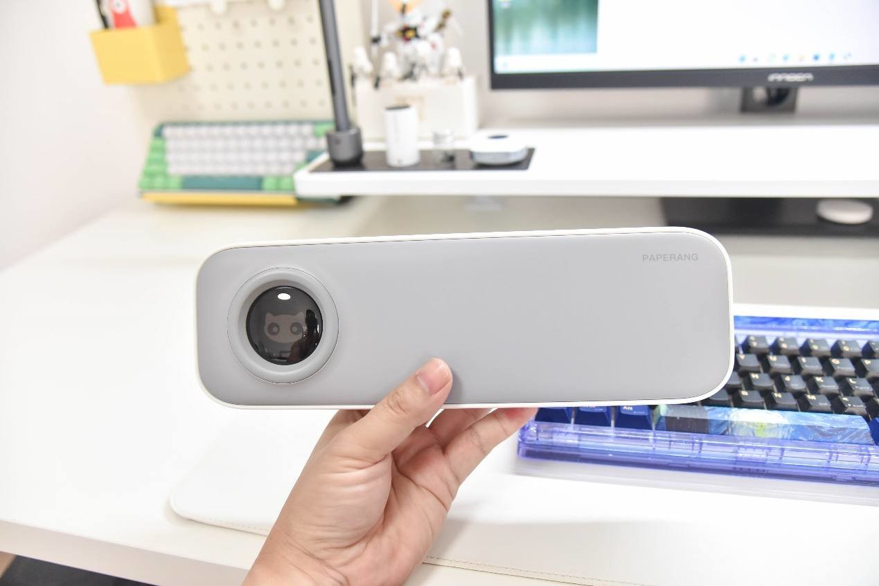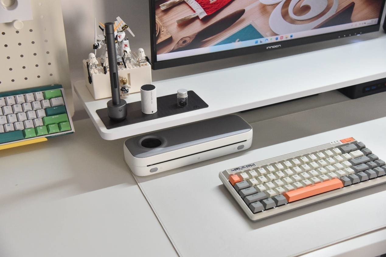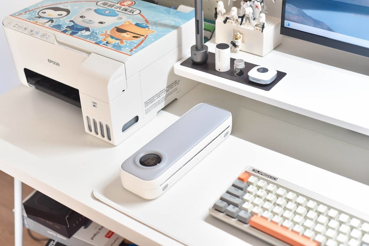 从体型来看,喵喵机F2S的基本上跟文具盒尺寸差不了太多,平时不用的时候,完全可以放在增高架下面,不仅仅不占空间,喵喵机F2S的外观设计还真有点好看,稍微点缀下桌面也是不错的。