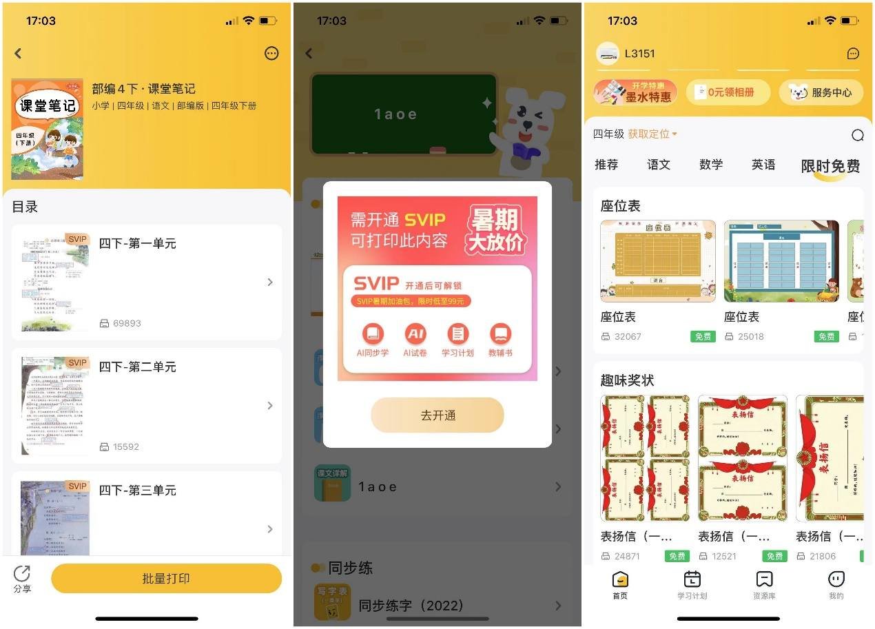不过在试着给孩子打印学习资料的时候,顿时有点尴尬了。我记得刚购入打印机的时候,我可以通过分享内容获得相应的积分,通过积分可以兑换资料下载券或者直接打印学习资料,现在就完全变成收费内容了。在限时免费内容里面,我们只能看到一些有趣的座位表以及奖状,到底要不要买个SVIP呢,我还是比较纠结的,毕竟价格确实不便宜,498一年,898两年,从三年级开始一直到初三,六年下来都小3000了。