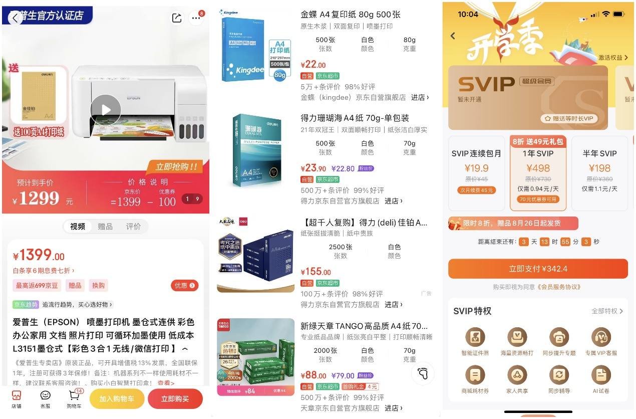 再来看Epson L3151的售价,现在官方认证店的活动价格为1299元,相对于喵喵机F2S,价格高出了将近一倍。再来看打印纸的价格,普通A4纸500张的价格为22块,大概是热敏打印纸的三分之一,另外就是SVIP卡的价格,如果我们不需要相关的学习功能,暂时可以忽略这部分的费用。由于Epson L3151采用的是联供式的墨仓,所以墨盒耗材的费用基本包含在打印机里了,这部分的费用也可以忽略,那么打印一张A4纸的价格大约是0.044元。
