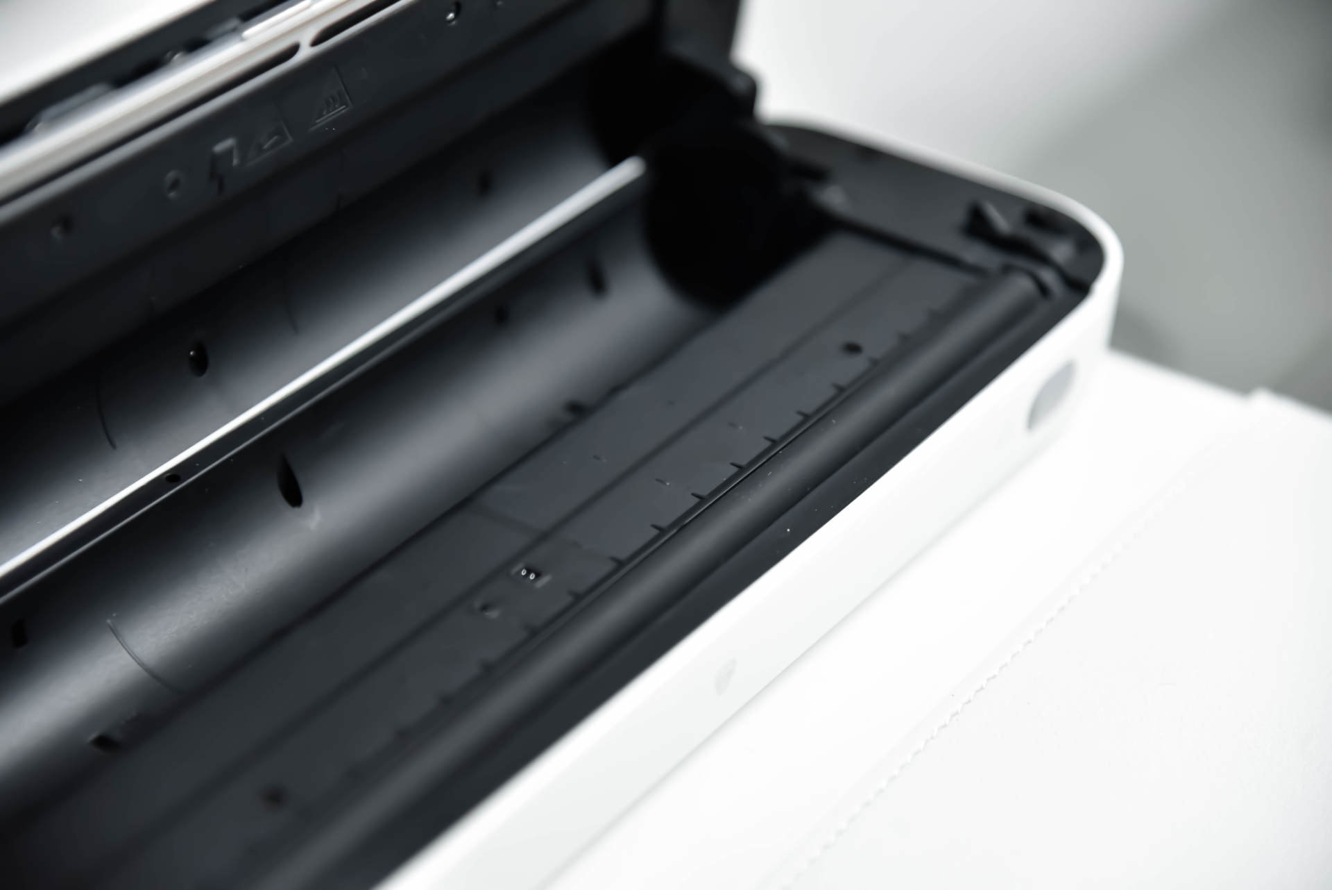 不过需要提到的一点是,由于更加轻巧设计以及续航的需要,喵喵机F2S并没有自动裁切功能。不过F2S采用双方式装纸,既可以选择卷纸,又可以选择A4折叠纸。如果我们选择的是卷筒纸的话,在手动裁剪的时候纸张的上下部分容易出现不规则锯齿纹;要是我们选择的是折叠纸的话,其每张A4都采用了锯齿边缘设计,就像发票可撕的边缘处理一样,打印完直接撕,不规则锯齿纹的问题就可以解决了。
