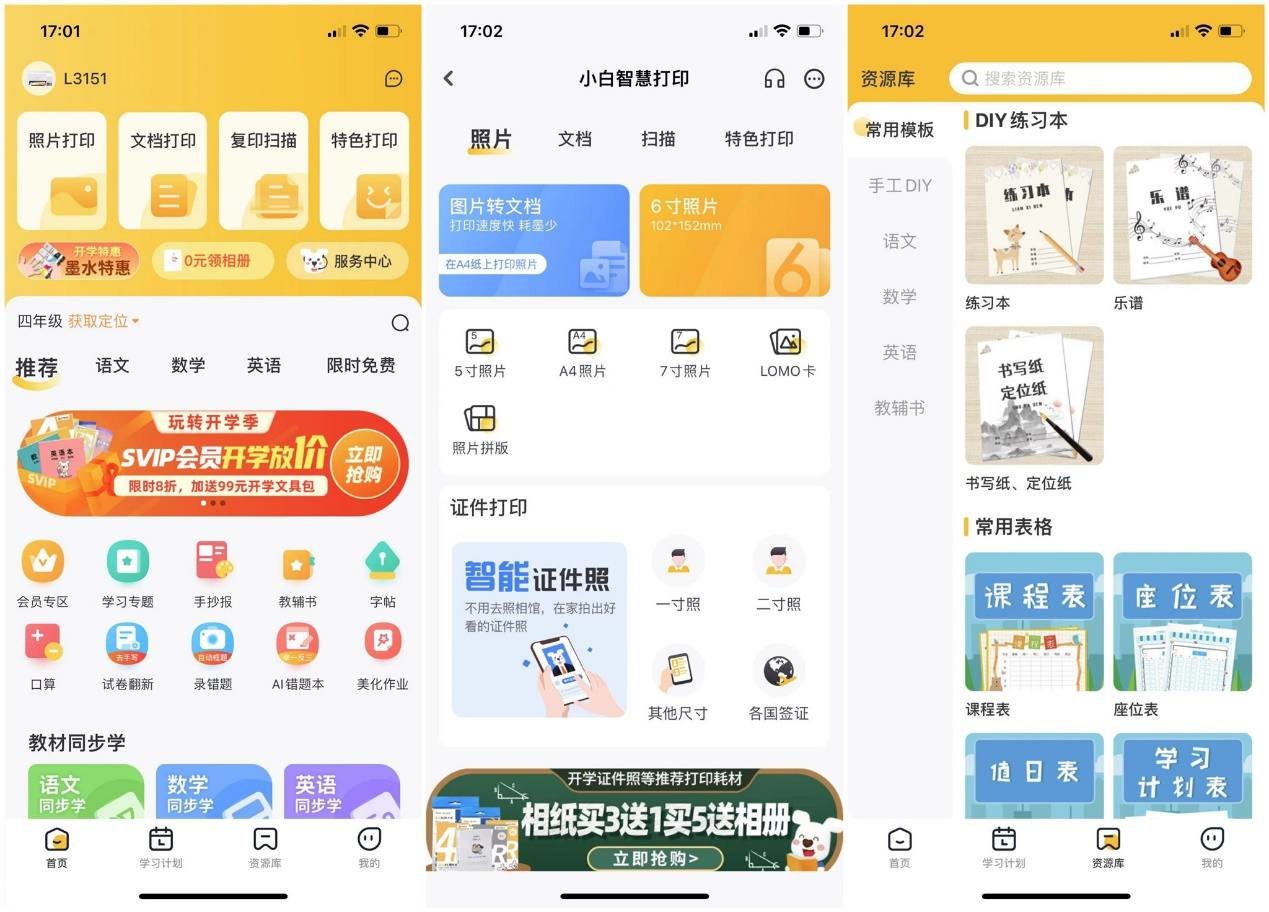 在Epson L3151的小白打印app中,我们看到了非常丰富的功能界面,有照片打印、文档打印、特色打印等,最吸引我的内容无疑是相关的学习功能,毕竟现在学校号召“减负”,学校里布置的作业越来越少了,很多复习的工作就留到了家里,所以给孩子找些同步资源就更加重要了。