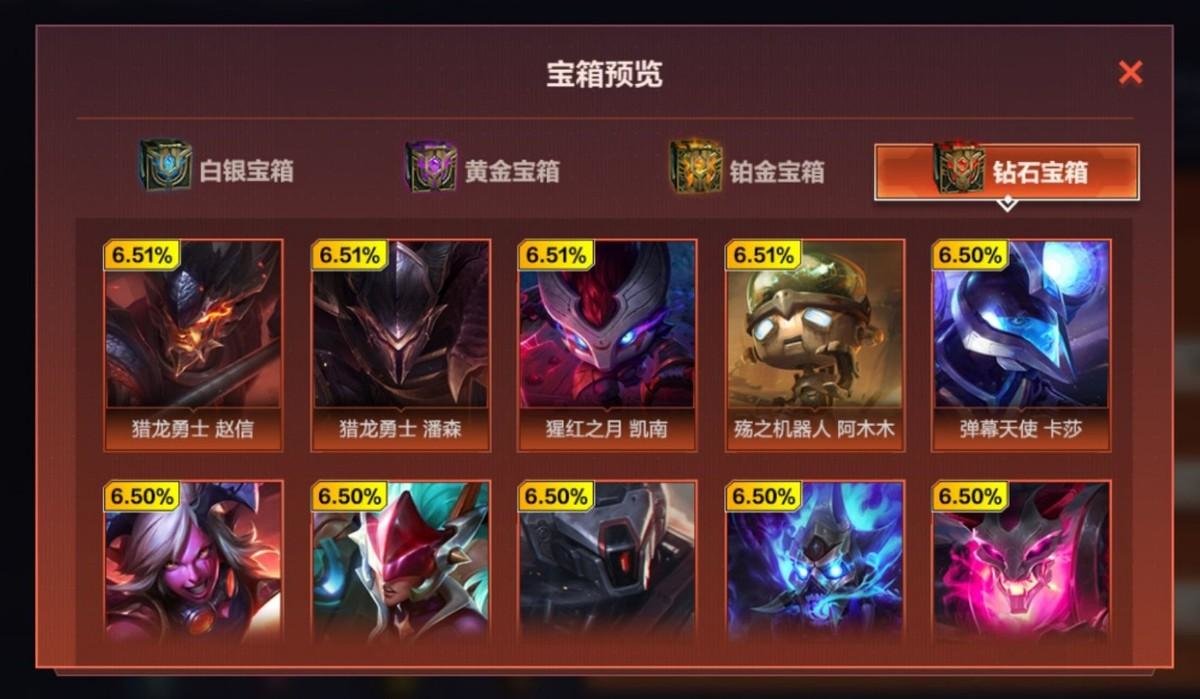 最初级的白银宝箱奖池中包含“暴风女神 娜美”、“游侠法师 拉克丝”等普通品质皮肤。但宝箱会不断升级,越高等级的宝箱也对应更高品质的皮肤奖励,玩家们将有机会得到“欧米伽小队”、“暗星”等系列皮肤。