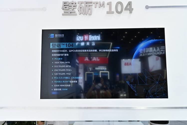除了BR100芯片以外,壁仞科技展台还展示了BR104芯片,这是一款单DIE(裸片)芯片,性能约为BR100芯片的一半,可提供1024 TOPS INT8 tensor,512 TFLOPS BF16 tensor,256 TFLOPS TF32+ tensor,128 TFLOPS FP32 tensor;它有32GB HBM2E内存,超150MB片上缓存,覆盖不同层级市场。壁砺104搭载是BR104芯片,基于标准PCIe形态打造,功耗在300W以内,紧凑的形态设计也带来了更强的适应性,可以适配多种2-4U的服务器。