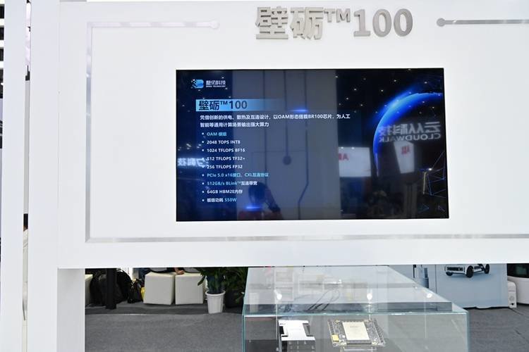 BR100芯片在国内率先采用Chiplet技术,新一代主机接口PCIe 5.0,支持CXL互连协议,而BR100芯片也让中国的通用GPU芯片迈入“每秒千万亿次计算”新时代,最为重要的是,这是第一次全球通用GPU算力纪录由中国企业制造。同时展示的壁砺100 OAM模组,搭载的正是BR100芯片。