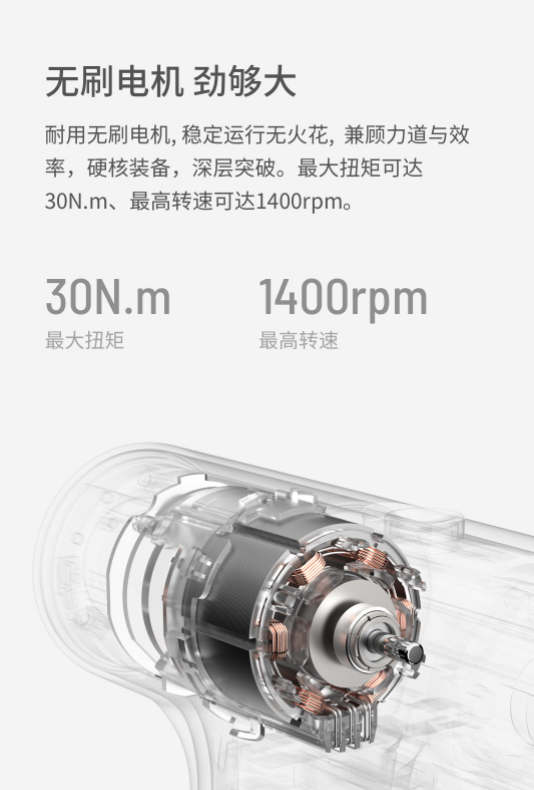 电钻的核心就是电机,提供“转”的原动力。小猴12V无刷电钻搭载的是现在市场上更常见的无刷电机,与传统的有刷电机相比,无刷电机寿命更长,对维护的需求较低,可控性更优,更适合作为自备家用的电钻。