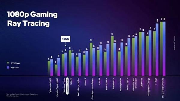 根据 Intel 的测试结果,A770 的光线追踪性能要强于 NVIDIA 的 RTX 3060 显卡,在进行测试的 17 款游戏中,A770 只在《F1 2022》《银河护卫队》和《战地 5》三款游戏中的光追表现逊于 RTX 3060。