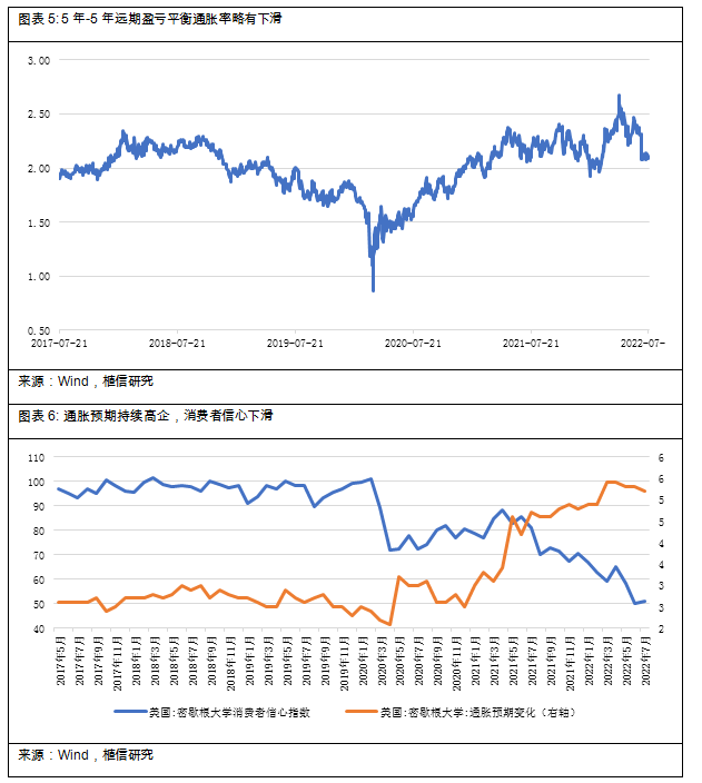 3月以来美联储的货币紧缩虽然对抑制通胀和通胀预期起到了一定作用,但效果并不理想。债券收益率中隐含的金融市场通胀预期近两个月以来略有下降,五年-五年远期利率下降从4月的高点2.5%下降至8月的2.3%左右。密歇根大学调查的长期通胀预期下降到2.9%,纽约联储调查的消费者对未来一年的通胀预期持续上升、对未来三年的通胀预期维持在3.2%左右波动,离美联储将长期通胀预期稳定在2%左右的目标仍有较大距离。
