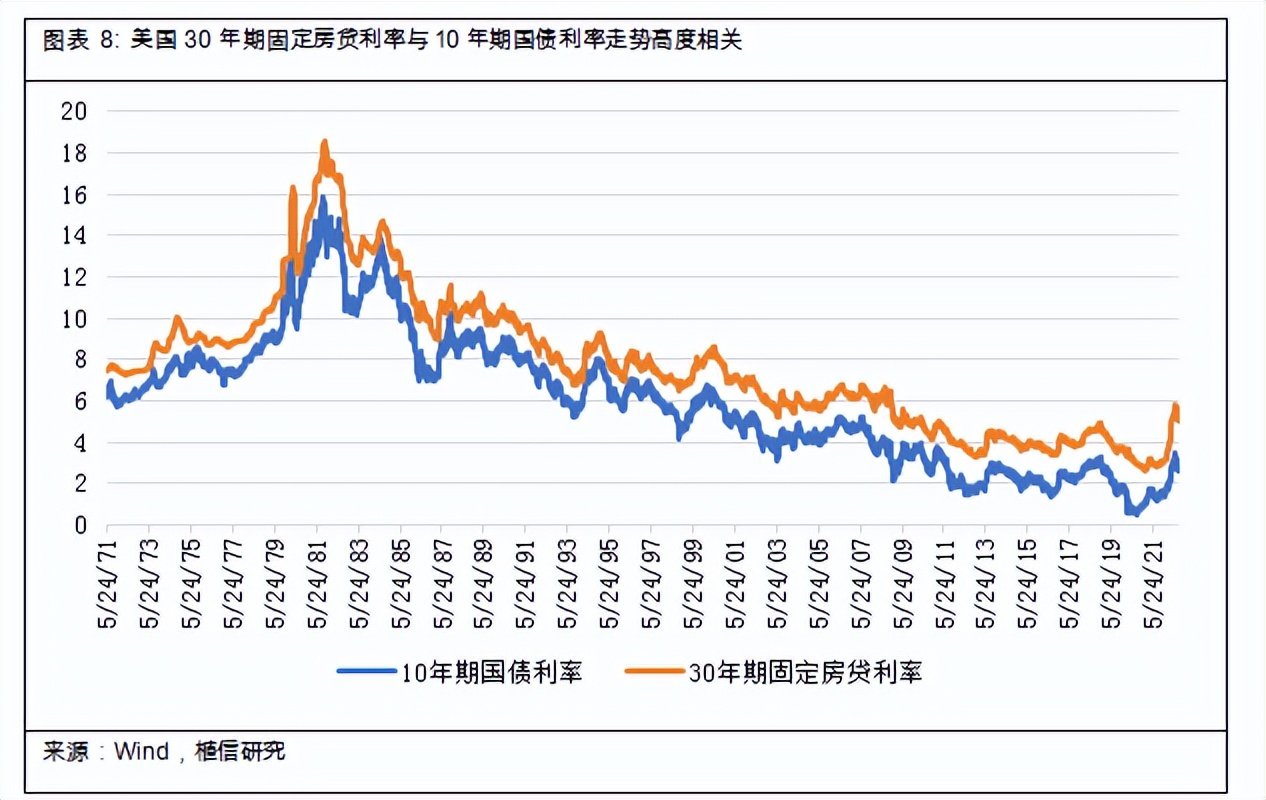 美国30年期固定房贷利率与10年期国债利率走势高度相关。美联储加息推动房贷利率上行。自美联储退出量化宽松以来,30年期固定房贷利率已经由2021年1月的最低点2.65%上行至5%以上,较2021年三季度2.87%的水平上升了约240个基点。由于美国通胀下行的趋势仍未确立,预计年内美联储仍将继续加息,推动长端美债利率走高。