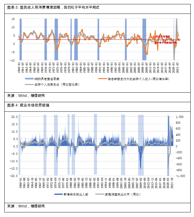 通常美国经济是否出现“实质性衰退”是由国家经济研究局(NBER)认定的。NBER最为看中的评判指标,一是除去转移支付以外的实际个人收入,二是就业的情况。从历史上的经济衰退阶段来看,在1960年后美国经济的9次衰退中,除去转移支付以外的实际个人收入的同比增速有7次下降至了零以下,新增非农就业人数每次都会转负、家庭调查的就业水平同比增速同样也每次都转负。目前来看,除去转移支付以外的实际个人收入的增速虽然在过去几个月大幅回落,但还位于1.8%以上,处于历史平均水平附近,离转负还有一定的距离。7月非农就业人数仍维持在50万人以上,超过1960年以来大部分未发生经济衰退的时期。家庭调查的就业水平增速虽然出现拐点,但离负增长同样有较大距离。因此,尽管近两个季度GDP增速收缩,但大概率不会被NBER追认为经济衰退。