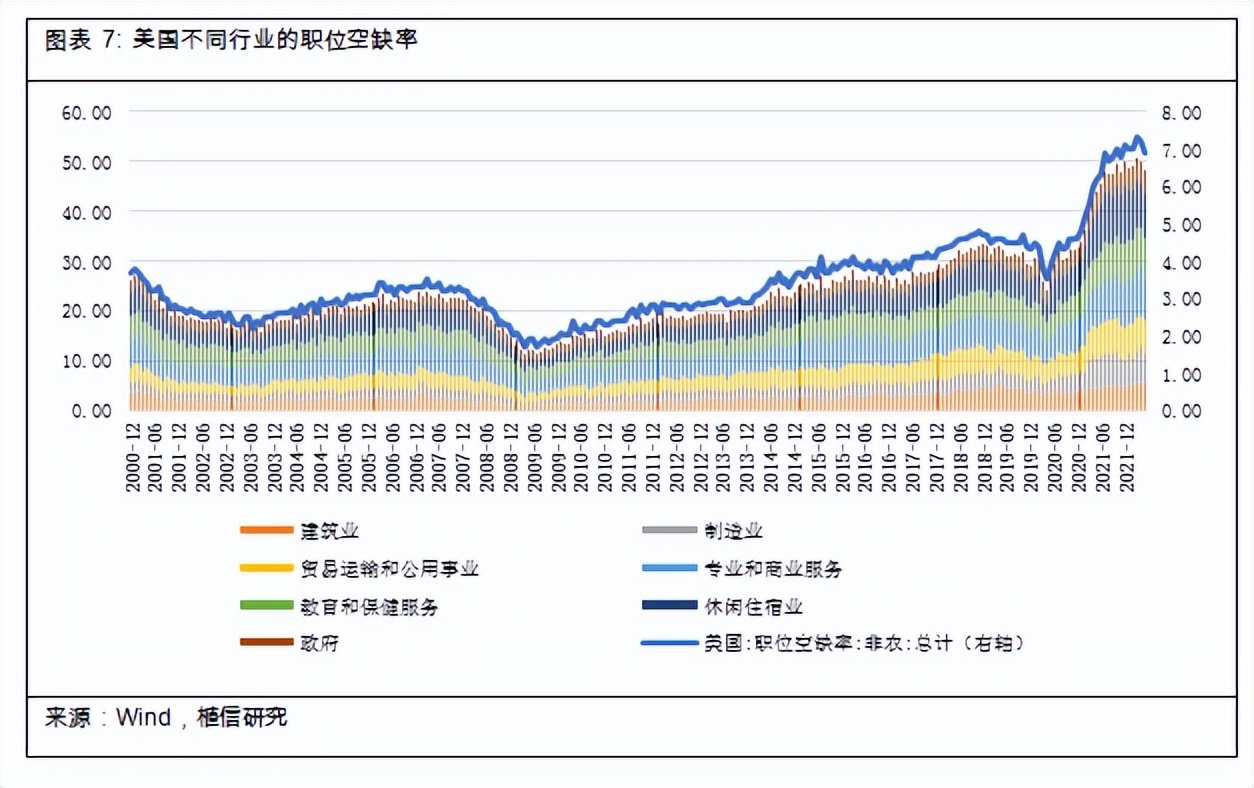 再次,美国劳动力供给短缺和结构性失衡将长期制约经济发展。自2010年起,美国劳动年龄人口在总人口中的占比就已经开始加速减少,疫情更导致许多55岁以上人口提前退休,劳动参与率持续位于62.5%以下,不到疫情之前的水平。疫情前美国就业市场就呈现出结构性失衡问题,耐用品制造、专业和商业服务、教育和医疗、休闲和住宿行业的职位空缺率显著高于其他行业。根据美国商务部的测算,即使全部有耐用品制造业工作经验的失业人员都被雇佣,也仅能满足该行业65%的空缺。而交通运输、建造业、采矿业的劳动力则过剩。目前美国的失业率已经小于自然失业率,但产出缺口却依然存在,说明美国的劳动力短缺将会成为长期问题,并非货币或财政措施可以化解,从而持续成为制约经济发展的内在因素。