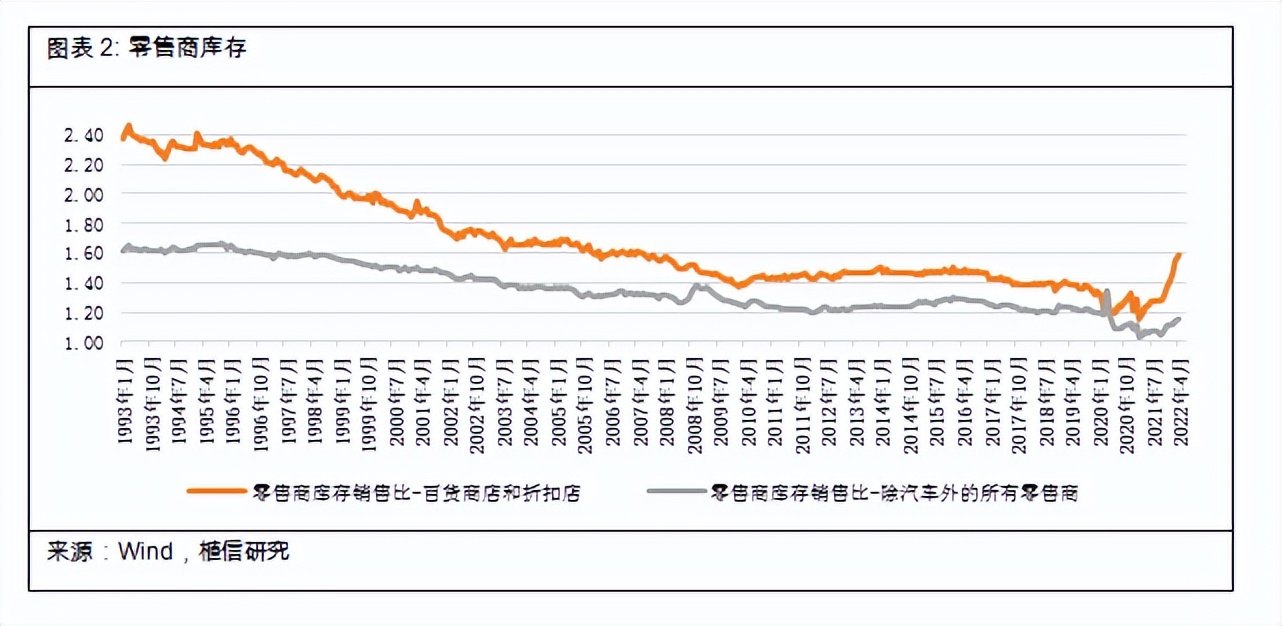 过去两个季度的GDP收缩可能夸大了经济运行中的衰退信号。逆向“长鞭效应”对于库存投资的冲击可能会在接下来几个季度中逐渐减轻。零售库存积压既有消费需求降温的原因,也反映了疫情后消费习惯改变带来的结构性供需错配问题。疫情期间美国消费者对于家具、家电等与居家生活相关的商品消费上升,零售商的过剩存货主要集中在这些品类。而随着社交和娱乐活动逐渐恢复,消费需求遂向服装、化妆品等商品转移。从零售商库存销售比看,虽然沃尔玛等百货商店的库存已经达到了2017年以来的高位,但整体零售商的库存还略微低于疫情前的水平。随着前期囤积的库存被打折出售,资金和仓储空间有了一定腾挪空间,零售商可能会增加对于与出行、社交、娱乐需求相关的商品库存。