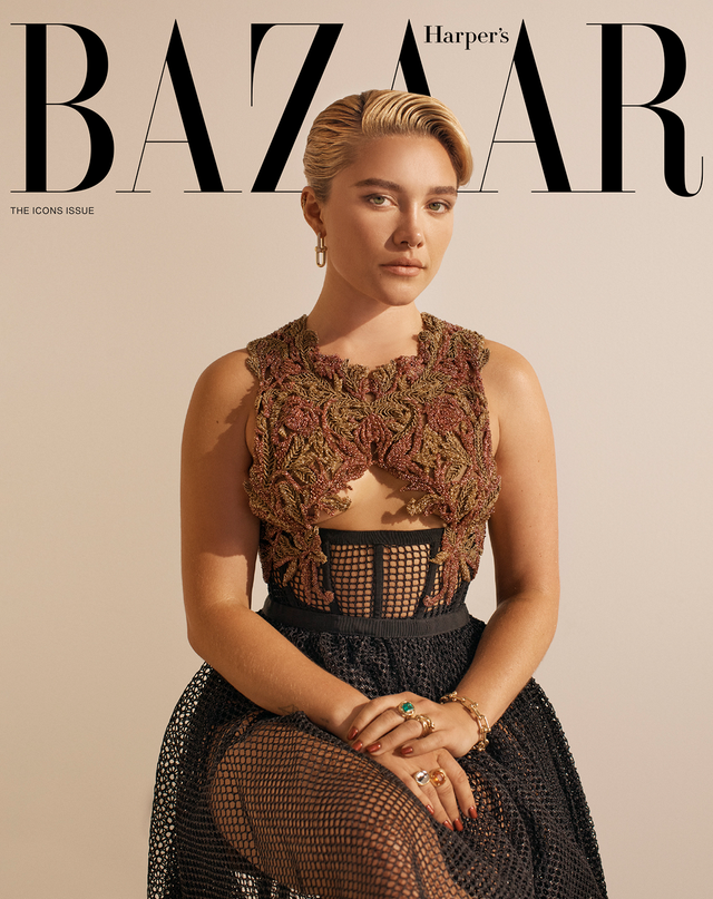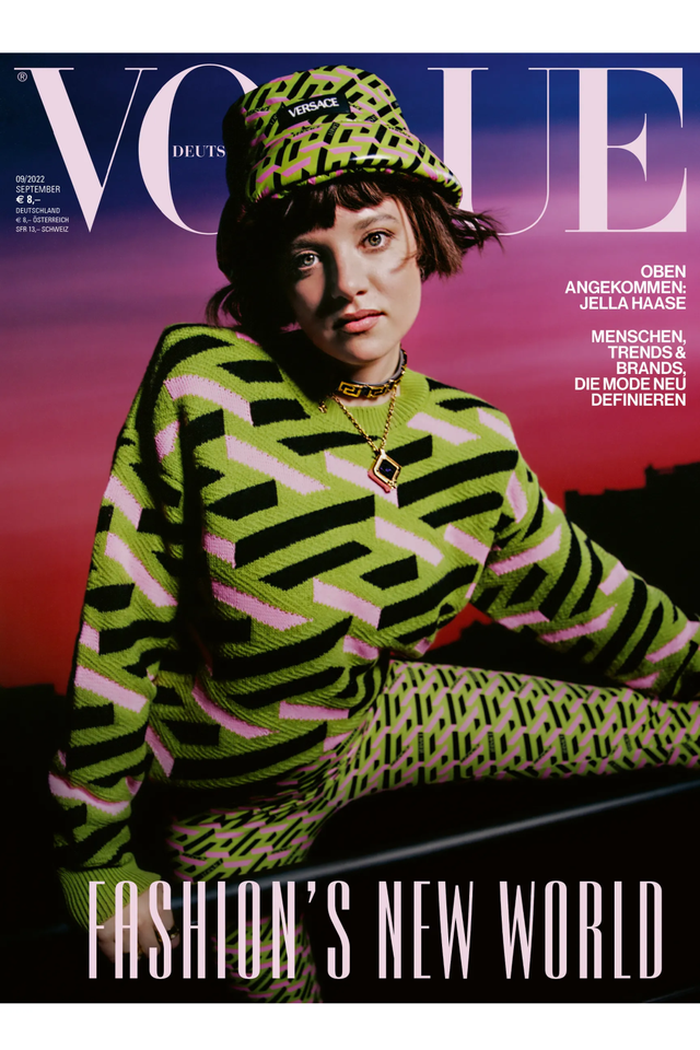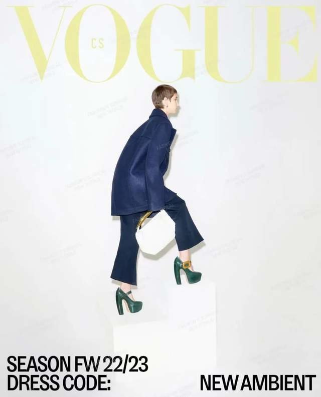 姿姿势别扭不美观,这是在压腿吗?衣服选得也不好,全套Versace老花,但这个老花并不好看,有点吵到眼睛,立体的老花要做好很考验设计功底。搭配上也没有花心思,同款老花的渔夫帽、毛衣、紧身裤套上,为了掩盖敷衍,装模作样戴了两条项链完事,这身模特都驾驭不住何况演员。背景和人之间互斥且廉价感十足,整体就阴恻恻的。前四小版本VOGUE(中日俄德,俄版因为俄乌冲突停刊)现在就全部出完了,没一封做得好的,无论是竭尽全力挣扎还是敷衍摆烂,都各有各的丑法,新主编们,长点心吧。