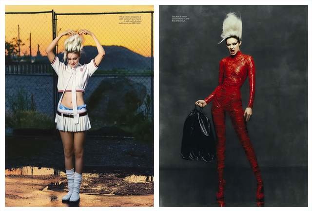 成品效果一般,炫彩霓虹色调,刊头和服装色彩等细节相呼应,整体因为打光问题有点显脏。红色调那封有股90年代的迪厅味儿(Prada这件皮衣挺好看),蓝白色调那封明暗交接,配合服装以及模特的表情,有种颓靡失落感。