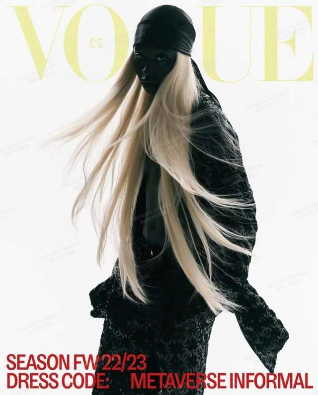 狙击审美的黑皮白毛(不是)的Dress Code是Metaverse Informal(日常元宇宙?渣翻不要介意),作为偏先锋概念的捷克版元宇宙这一热潮自然要跟上,少有的将模特脸涂成全黑,再加上全黑头巾和Chanel套装,身上唯一的白色只有眼白和白金长发,强烈且罕见的对比带有元宇宙的虚拟感。元宇宙尽管是建模虚拟出的世界,但也在追求真实,妆造冲击感强烈但至少也维持了真实特征,整体呈现效果点了Metaverse Informal的题。
