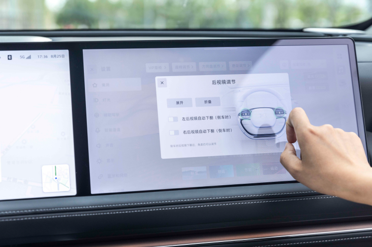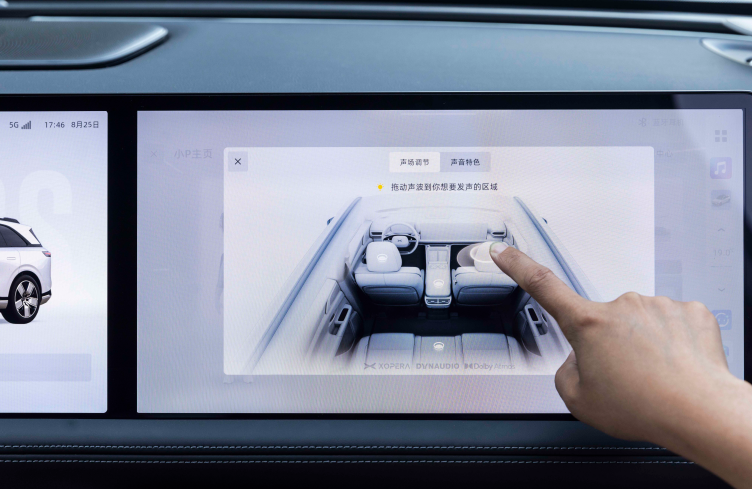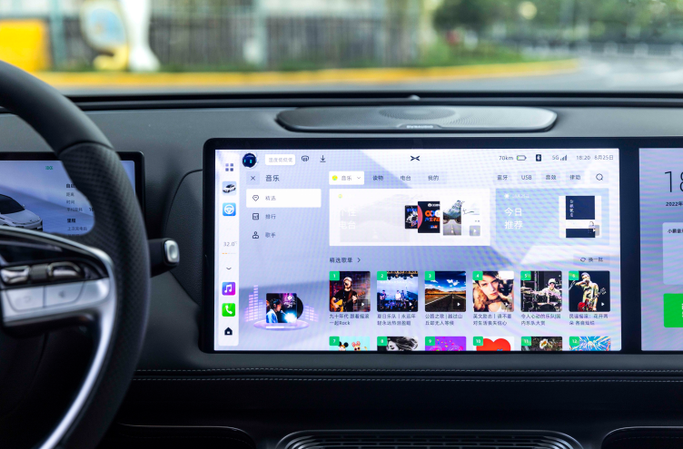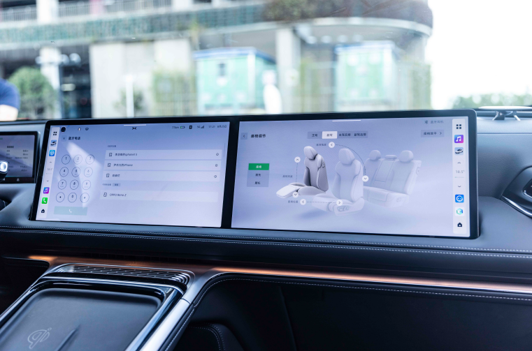 小鹏G9搭载了双联屏车机大屏,单块屏幕尺寸为14.96英寸,这两块屏幕间可进行信息交互,也就是主副驾可相互分享内容给对方的屏幕,提升智能属性的同时也增强了实用性。