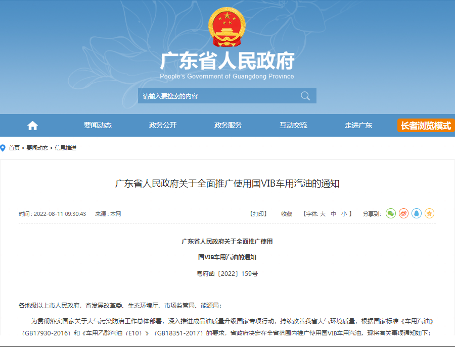 为贯彻落实国家关于大气污染防治工作总体部署,深入推进成品油质量升级国家专项行动,持续改善广东大气环境质量,近日,广东省人民政府办公厅印发《广东省人民政府关于全面推广使用“国六B”车用汽油的通知》(以下简称《通知》)。