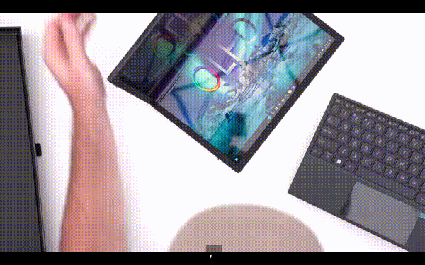 有意思的是,这两款折叠屏笔记本电脑都提供了屏幕后置支架,供我们在展开大屏时,即可上下拼接成两块1080P的屏幕拓展使用。不过很显然华硕灵耀X Fold的屏幕展开使用场景并不只限于上下显示,屏幕巧妙的支架让它还能“左右”拼接显示,接近一款窄边框的传统17.3英寸笔记本显示效果。对于需要初步上手体验折叠屏的笔记本用户来说,显然它做出的方案能让大家更容易适应!