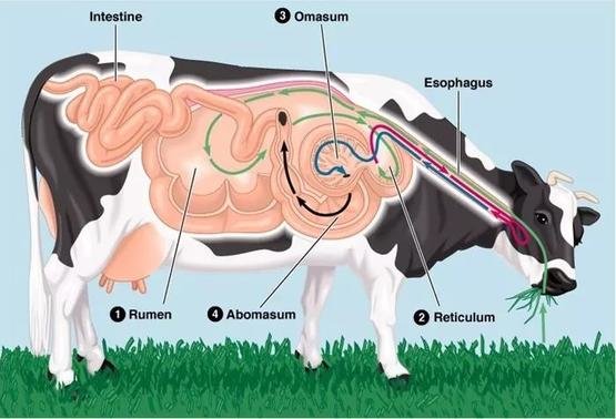 我们都知道,牛是典型的反刍动物,拥有多个胃室的胃,能消化一般哺乳动物无法利用的纤维素。牛的胃根据功能和外形不同分为4个部分,按食物经过消化道先后顺序依次分为:瘤胃、蜂巢胃、重瓣胃和皱胃
