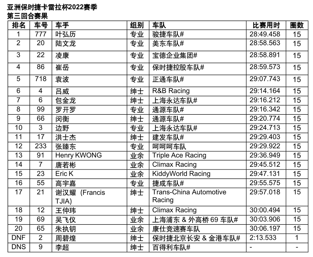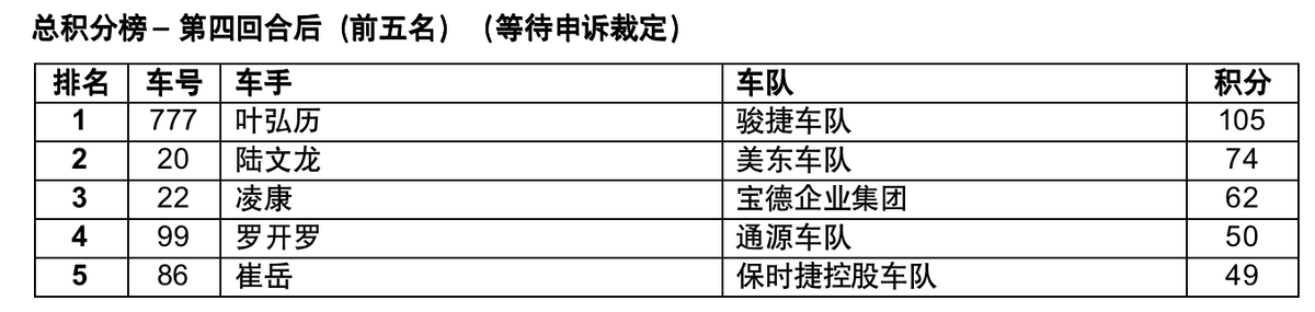 截至目前,来自骏捷车队的叶弘历以105分排在总积分榜第一名,同时,首次作为注册车手参加亚洲保时捷卡雷拉杯,并且入选青年车手人才库的罗开罗以50分排在总积分榜第四名。