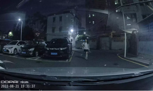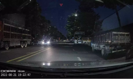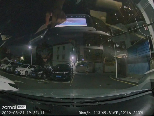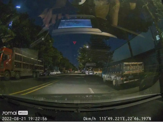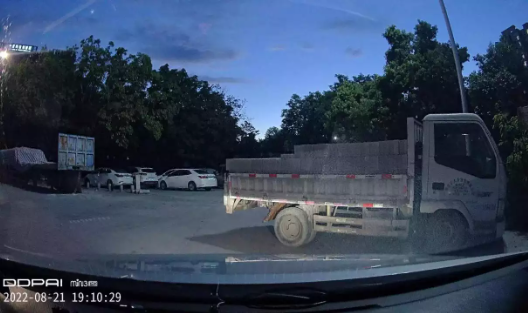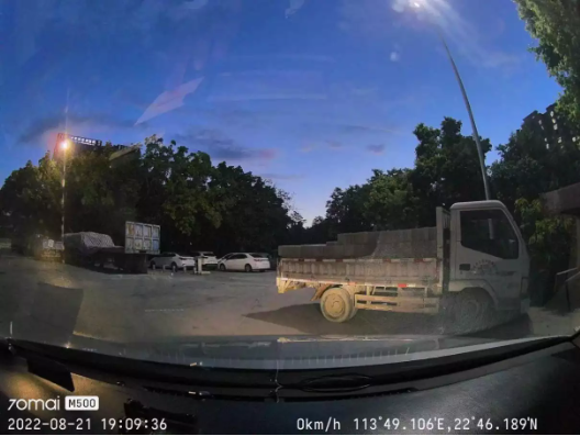 随着时间流逝,进入傍晚时分,两款行车记录仪的录像表现依旧不差。无论是近处的卡车,还是稍远一些停放的其他车辆,都拍摄得比较清晰。甚至就连远处建筑上的灯牌也能看得清楚。在这里也不难看出70迈的画面还原度是最高的。