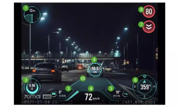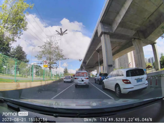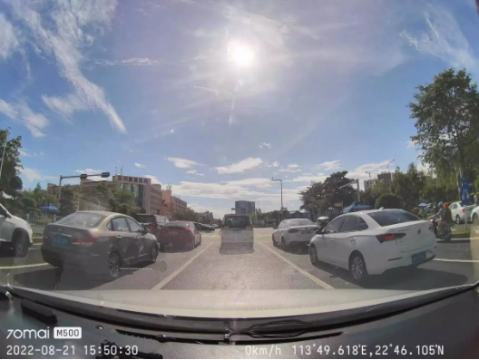 在逆光的场景里边,两款行车记录仪的录像也没有受到光线影响,成像都是清晰的。特别是70迈M500,虽然镜头直接拍摄到了当空的烈日,但是画面并没有出现过曝、亮度太高、细节不清晰等现象。