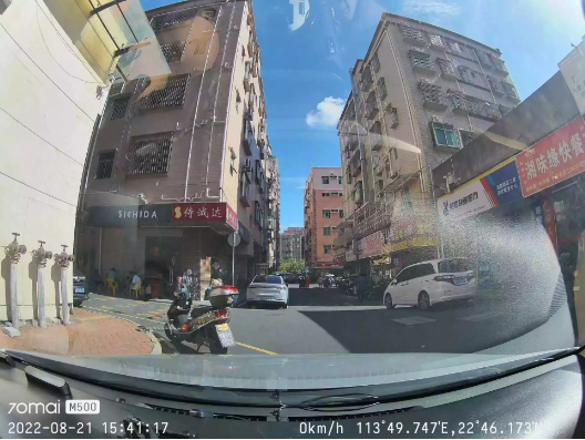 在对街道两边场景进行录像的时候,两款行车记录仪超广角的不同体现得更为明显。70迈M500视野要更为开阔一些,能够将街道两旁的车辆停放情况、店铺名称等信息更加完整地记录下来。