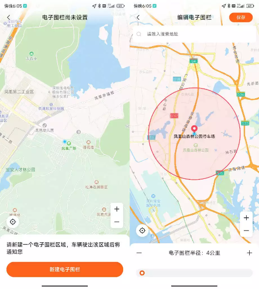 当然,我们也可以设置电子围栏范围以保证车辆夜间停放安全。如此一来,一旦车辆离开电子围栏范围,APP就会及时进行提醒。