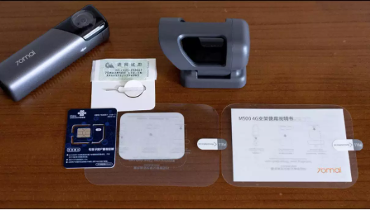 照片里位于下侧、体积较大的全黑色包装盒是70迈M500行车记录仪主机的包装盒。上方左边的浅灰色盒子装着搭配使用的4G支架。照片上方右边的长条形盒子则装着停车监控线。
