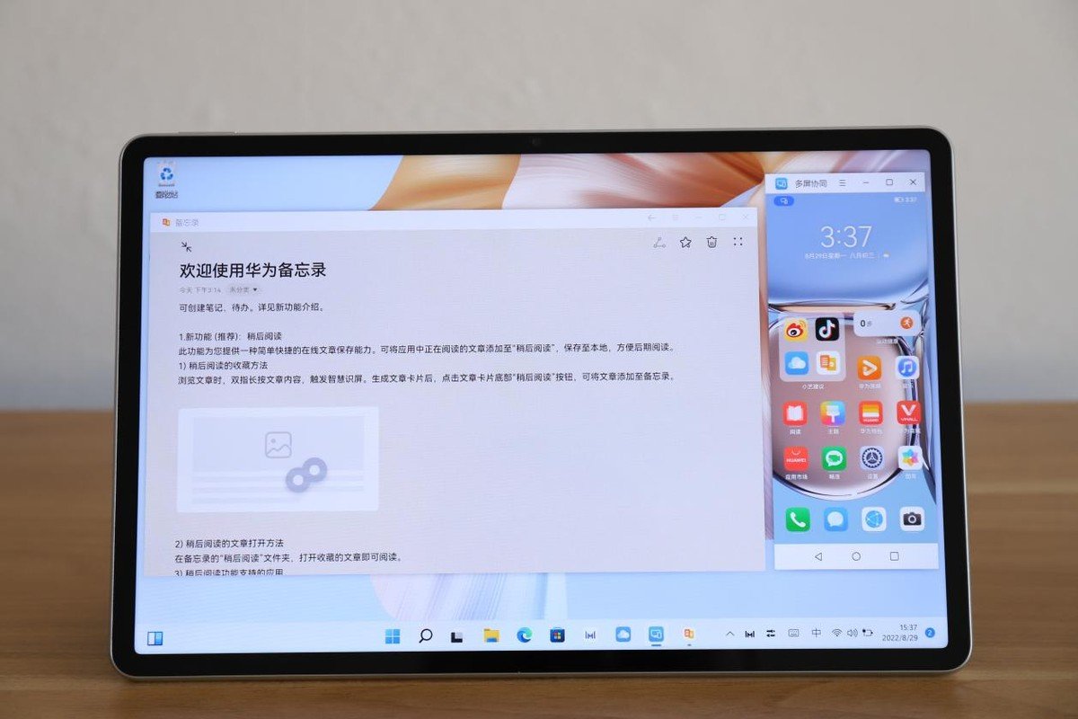 当你的手机使用的是HarmonyOS 3,就可以与华为MateBook E Go实现“横屏大窗口”,能够在笔记本的桌面上打开多个手机应用界面,比如打开同时打开微信以及邮件等APP,让你能在华为MateBook E Go的这块大屏幕上横屏体验手机上的功能。