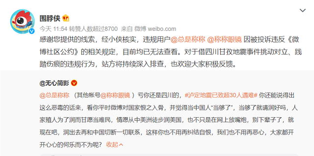 现在该网友的微博账号也被封禁,网友在拍手叫好的同时,也希望有关部门能找出此人,进行严惩,