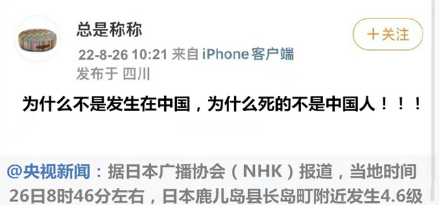 但是有细心的网友发现:今年8月份日本发生地震,该网友竟然说:“为什么不是发生在中国,为什么死的不是中国人。”