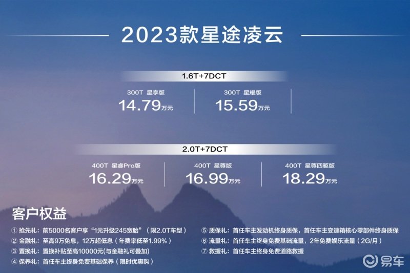 新车涵盖300T和400T两大动力产品阵营,共5个配置版本:300T车型售价14.79 – 15.59万元;400T 车型售价16.29 – 18.29万元,购买400T车型前5000名用户可享“1元升级245宽胎”。同时,为了让更多用户尽享疾速驾驭的快感,2023款星途凌云提供至高9万元免息、12万元超低息的金融礼,并可享至高1万元置换礼补贴(与金融礼可叠加);并且针对首任车主,提供终身免费基础保养(限时优惠购)、发动机和变速箱核心零部件终身质保、终身免费基础流量和2年免费娱乐流量,以及终身免费道路救援四大权益保障。