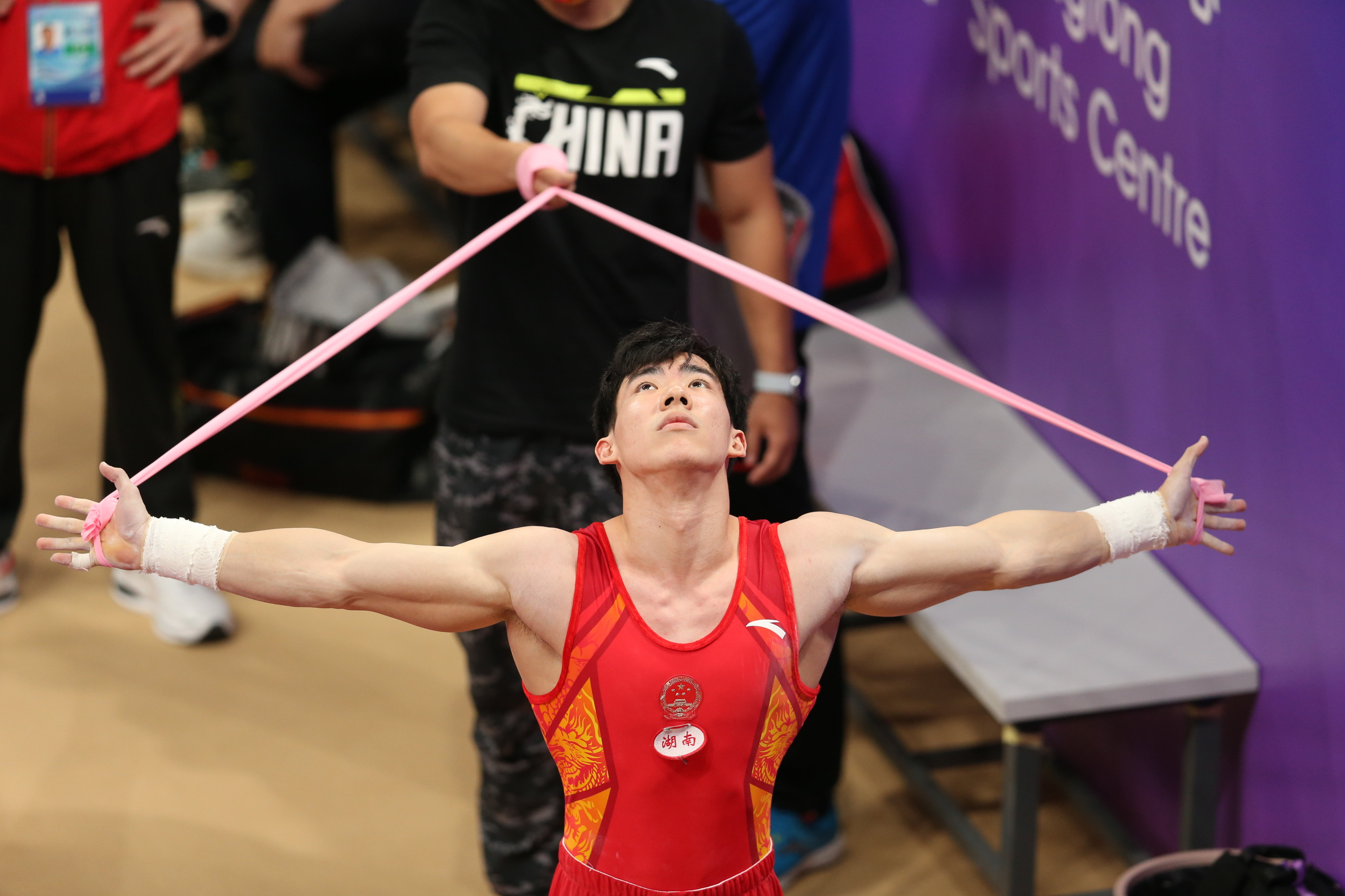 9月6日,张博恒在比赛间隙进行拉伸。新华社记者 许雅楠 摄