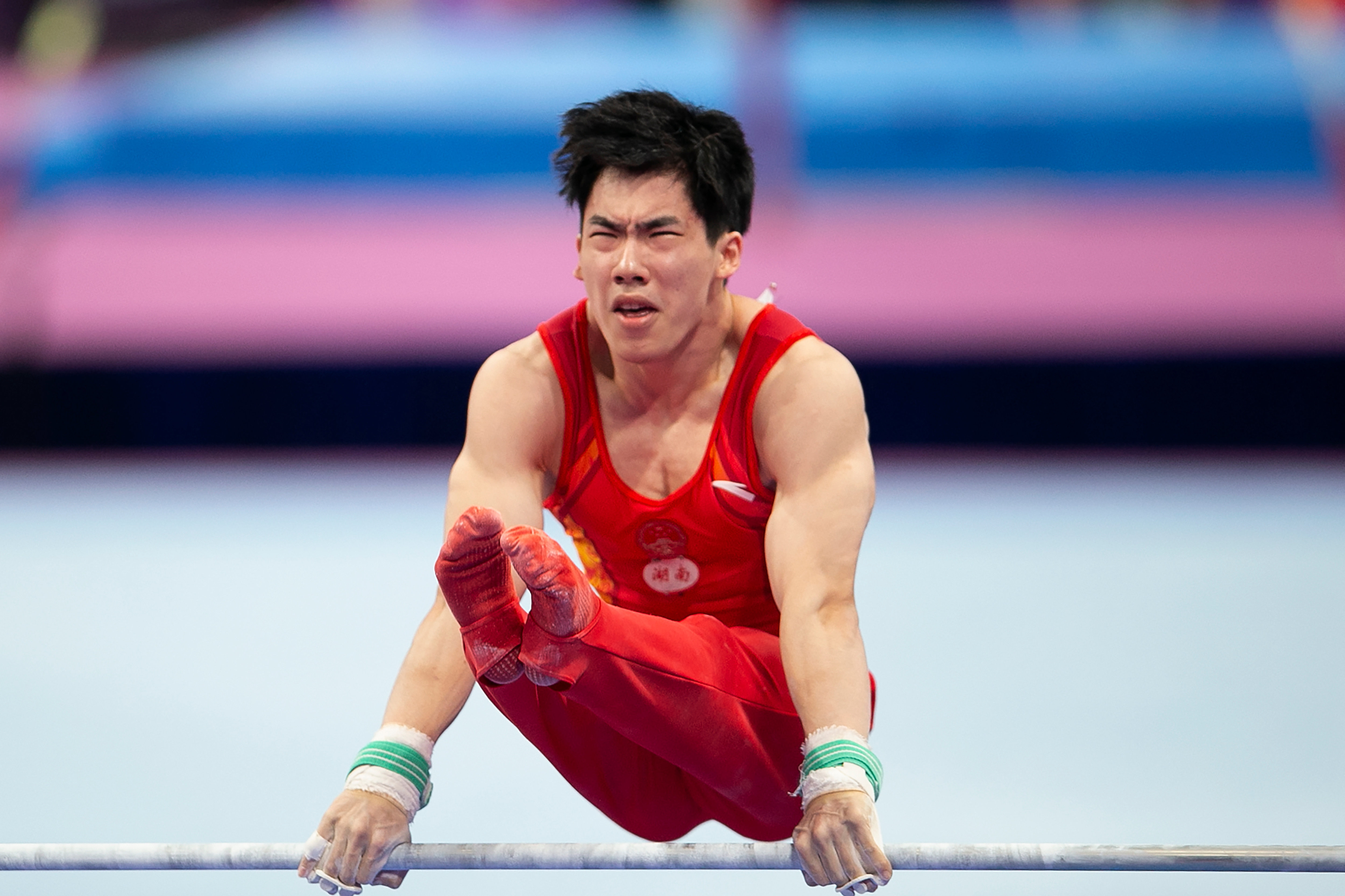 9月6日,张博恒在单杠比赛中。新华社记者 许雅楠 摄