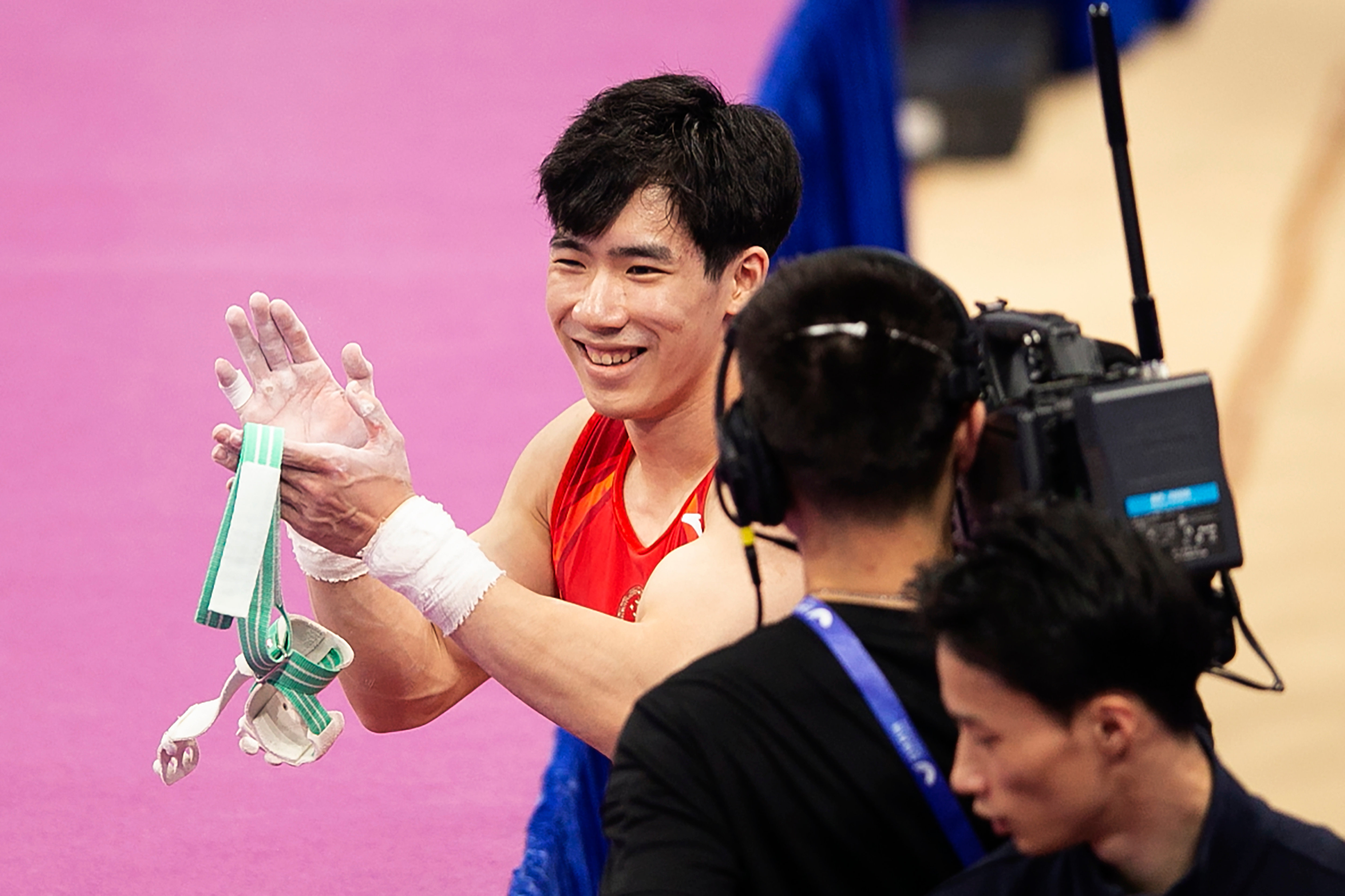 9月6日,张博恒在双杠比赛后。新华社记者 许雅楠 摄