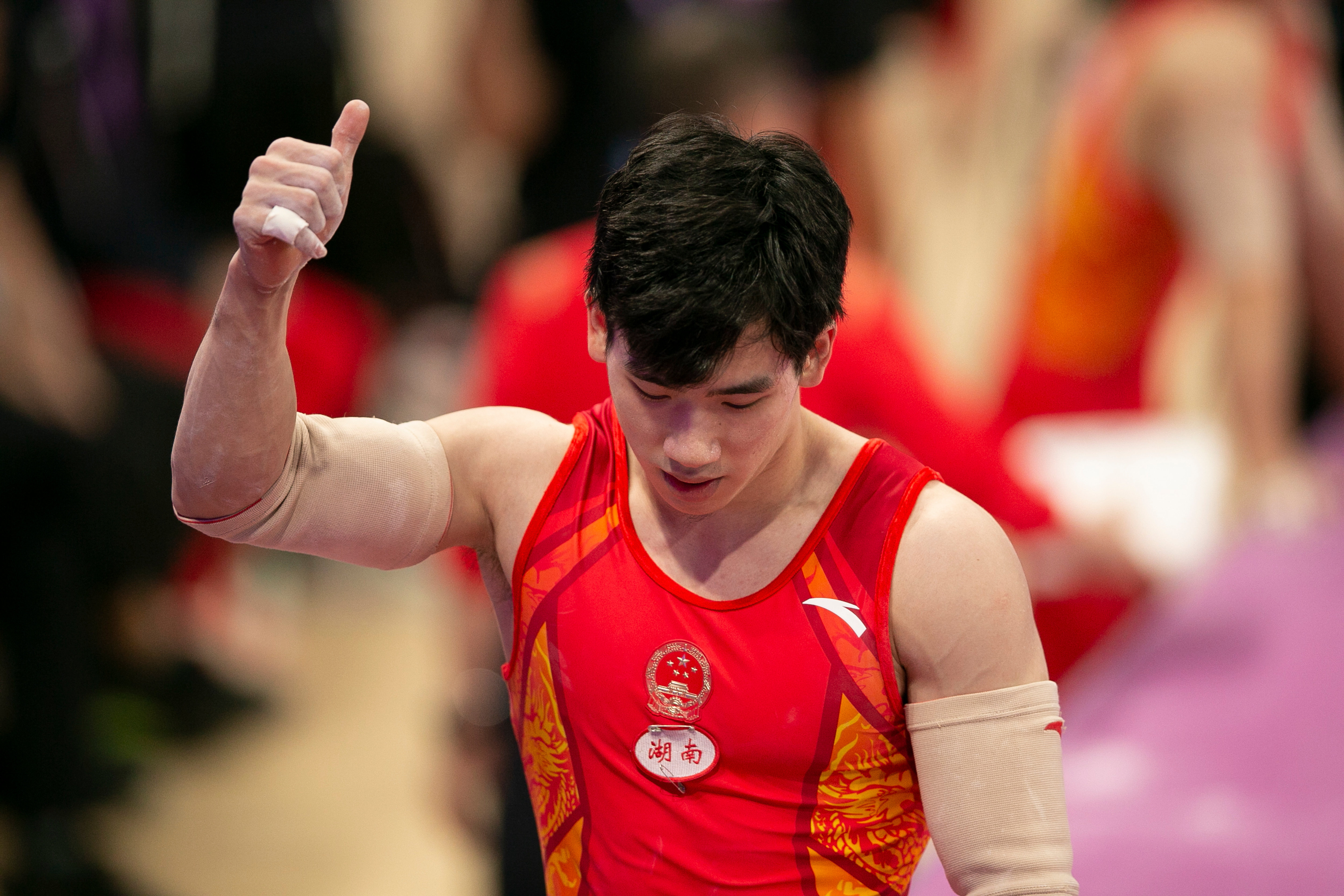 9月6日,张博恒在双杠比赛后。新华社记者 黄宗治 摄