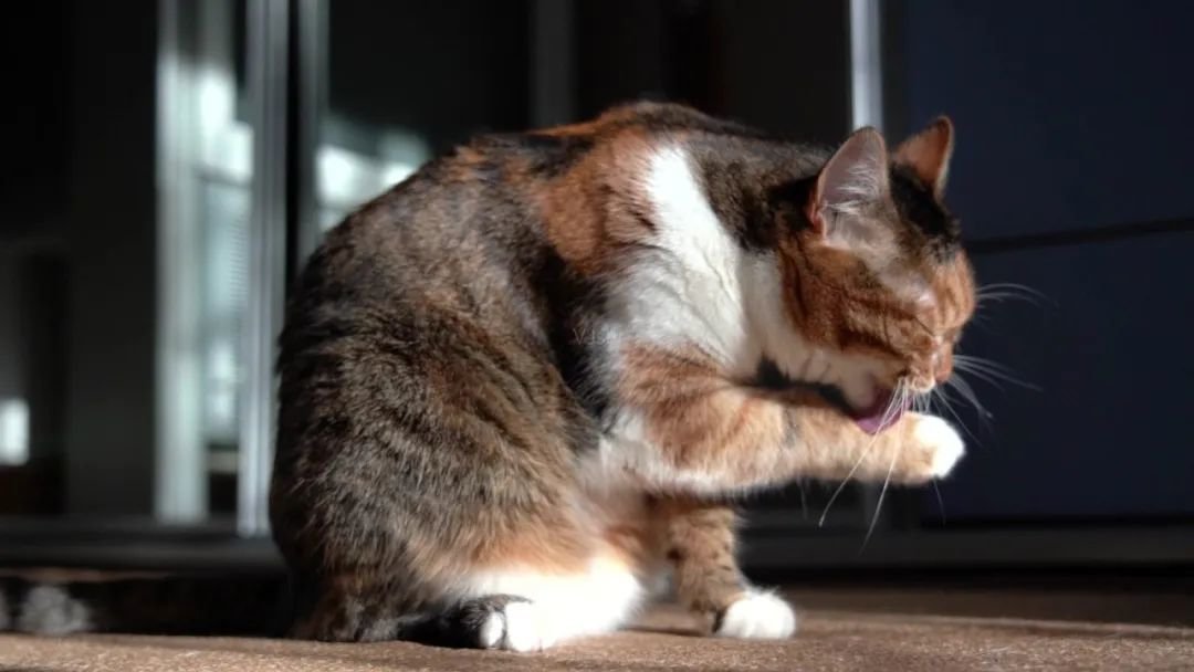 当猫处于高度紧张的状态下,会出现过度舔毛行为,这种行为会进一步伤害本就脆弱的皮肤,导致出现猫藓。