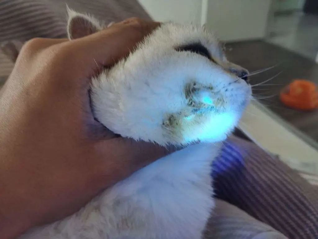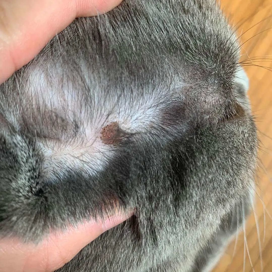 猫藓初期会出现局部掉毛,抚摸起来也有明显的结痂感,肉眼可见的皮屑。用伍德氏灯照会出现荧光反应。