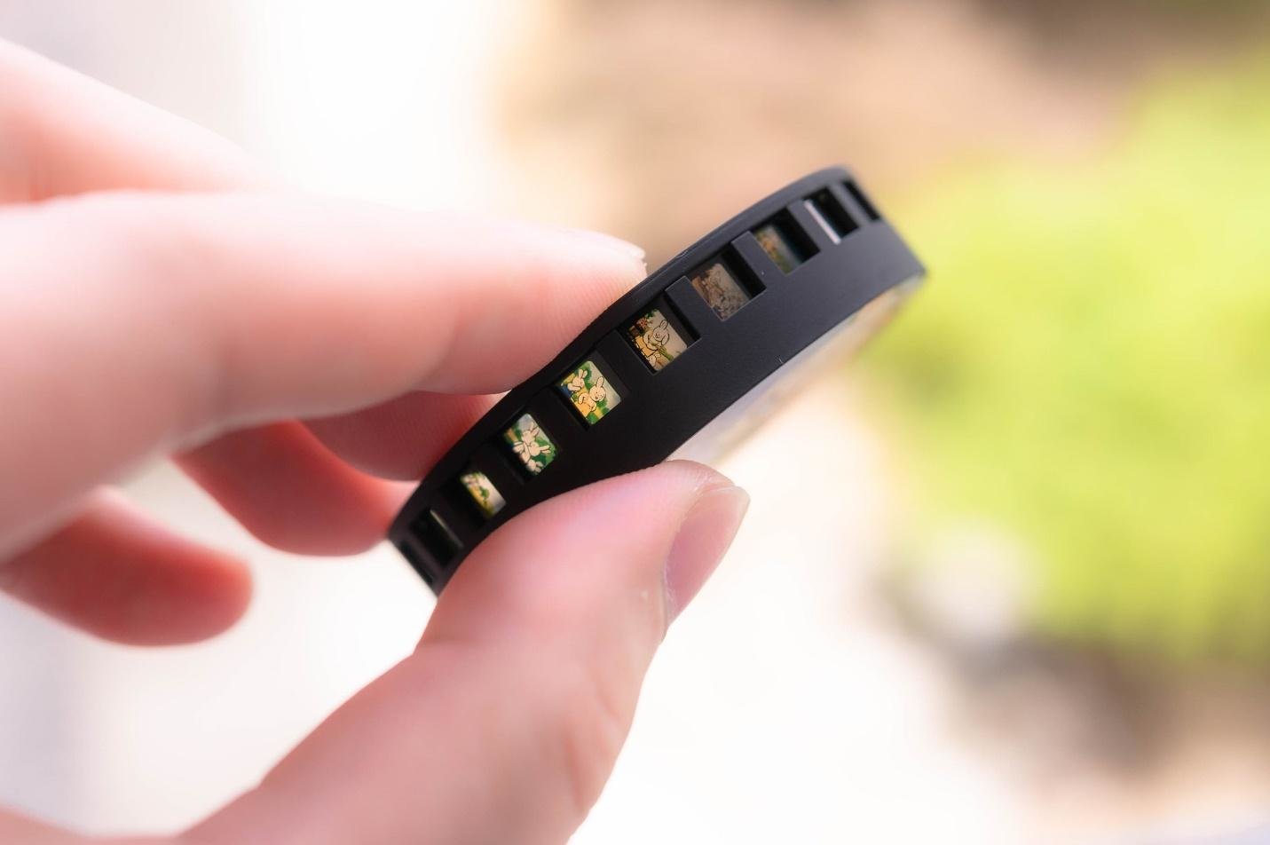 故事来自方放映机前部仓内的“胶卷”,还真的有和电影胶片一样的设计。