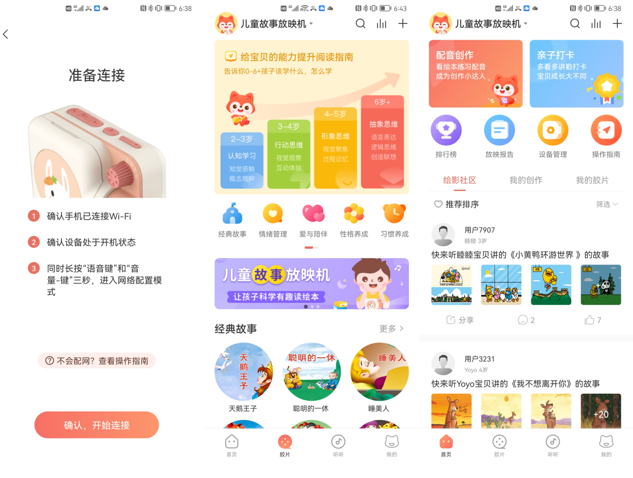 其他方面,在配网连接APP后有更多的儿歌、动画等内容可以选择,比较有意思的时还有一个绘影创作功能,家长或者孩子可以自己为胶片录音配音讲故事。