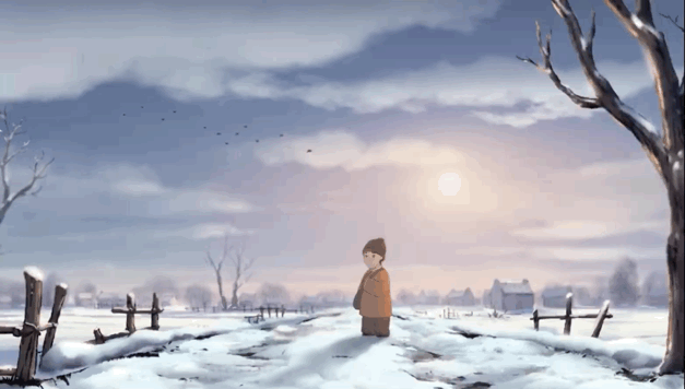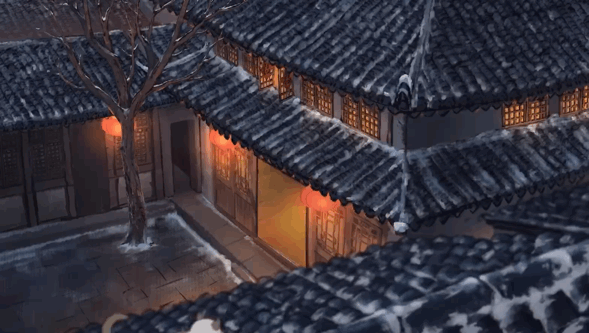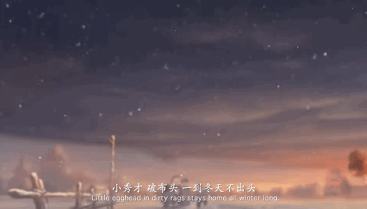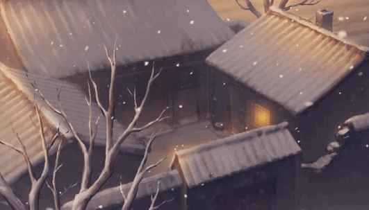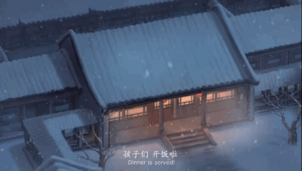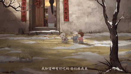 开篇音乐活泼、喜庆,市井的喧闹声随即响起,昏黄白日中,大雪静静地,漫天飞舞。
