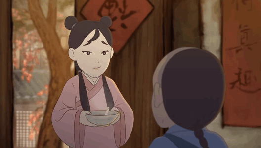 第二天,“小秀才”放学归来的路上,六娘叫住了他,回赠给他一碗热乎乎的红豆汤,吃得小秀才脸颊绯红、热泪盈眶。