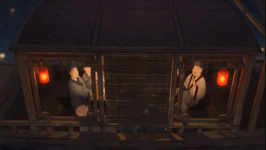 仔细品味,我们还能发现动漫中的秋月也终于钻出了云层,清朗地照耀人间。一船人喜笑颜开地赏起了中秋佳月。
