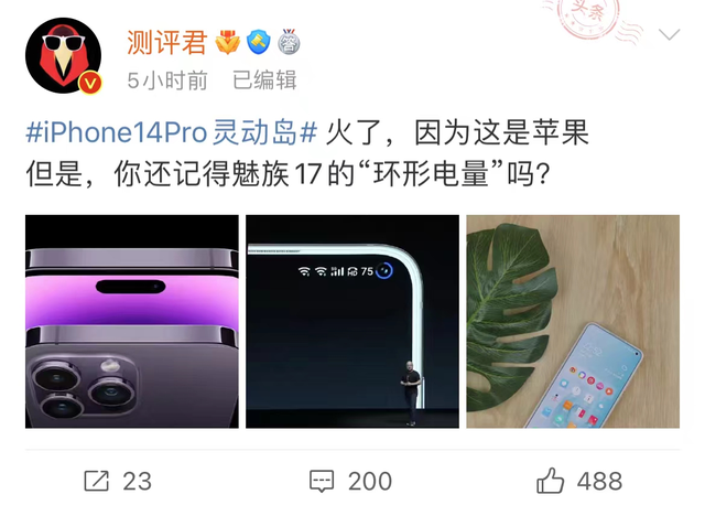 (iPhone 14 Pro/Max的灵动岛设计让人们想起魅族的环形电量设计)