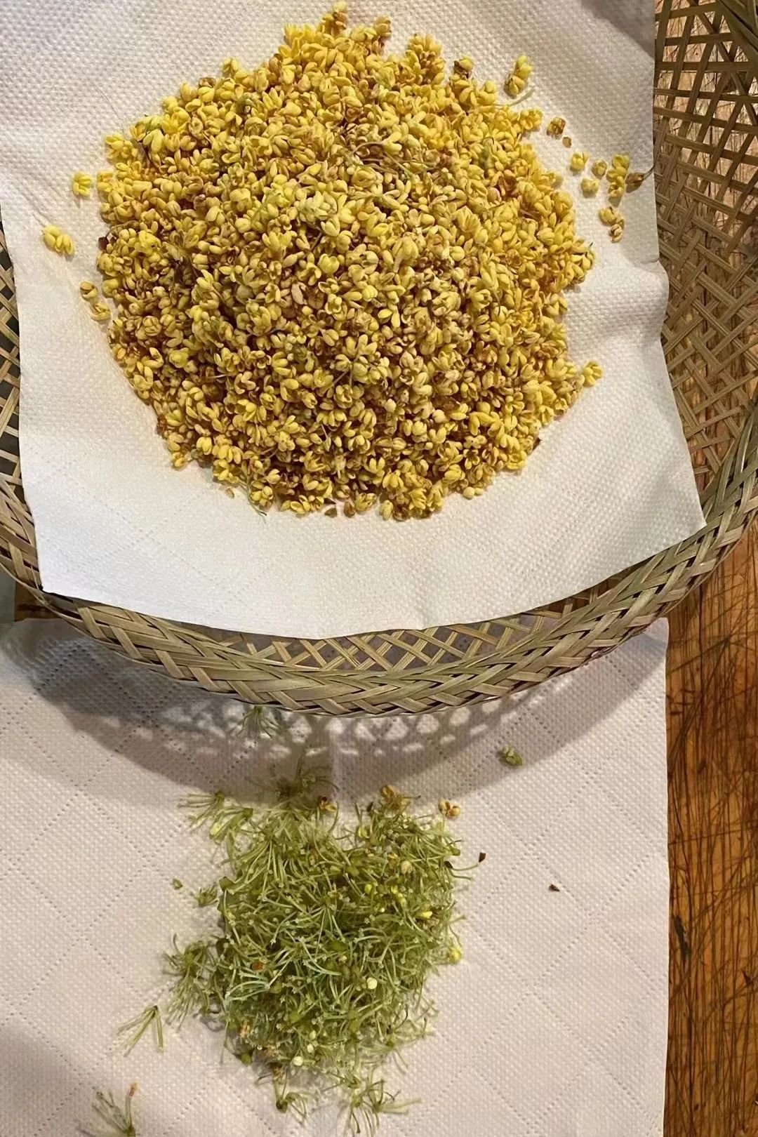 从蒲江明月村的桂花树收集细小的花朵,英姐耗费两个多小时,今年最早一批的糖桂花试做成功。食客们盼望更多糖桂花的到来。